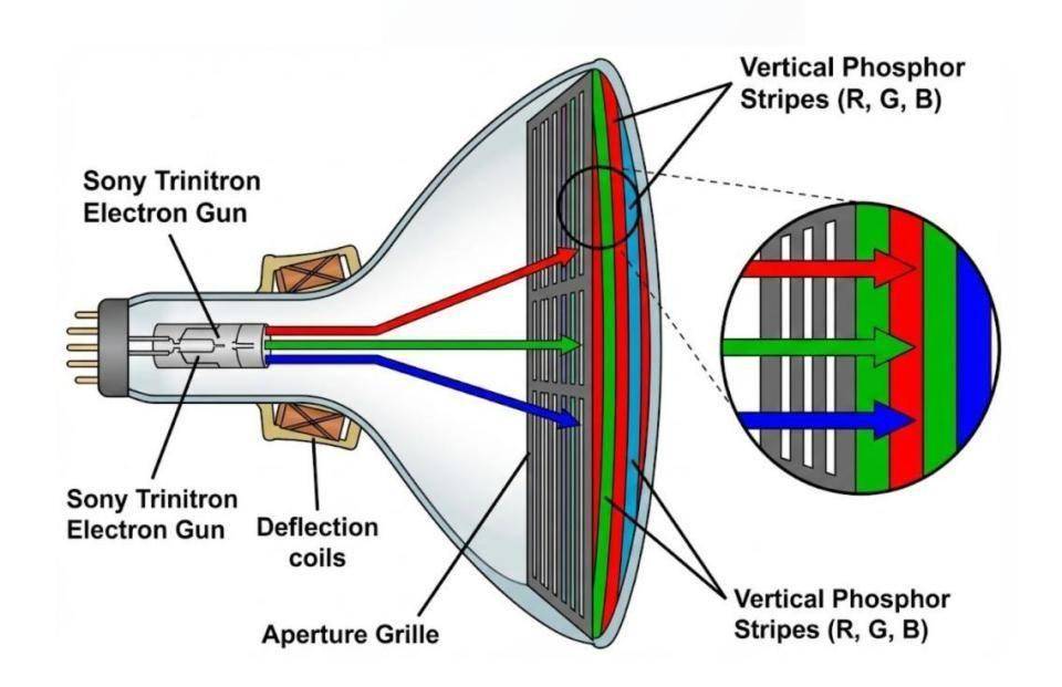 当时的电视还是以CRT,也就是显像管为核心制造的,这是一种与LCD等现代显示面板完全不同的显示技术。CRT的原理解释起来挺复杂的,大家可以理解有三道电子束,分别对应红绿蓝三原色,从屏幕的左上角开始往右下角扫射,电子束击中屏幕内壁的对应颜色荧光粉后就会发出对应的颜色,然后这些光束的扫射速度高达一秒60次以上,以此形成完整的动态图像。